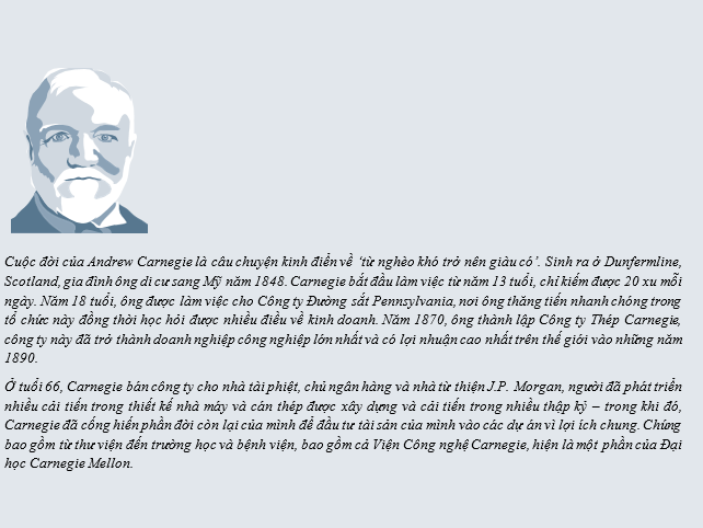 Là con trai của một thợ dệt đến từ Scotland, Andrew Carnegie đã là một doanh nhân thành đạt trong ngành đường sắt và điện báo khi Nội chiến Hoa Kỳ bắt đầu năm 1861. Sau chiến tranh, Hoa Kỳ chứng kiến sự bùng nổ trong lĩnh vực xây dựng. Đường sắt đã mở ra ‘Miền Tây hoang dã’ và các thành phố ở bờ biển phía đông của Mỹ đã phát triển nhanh chóng.