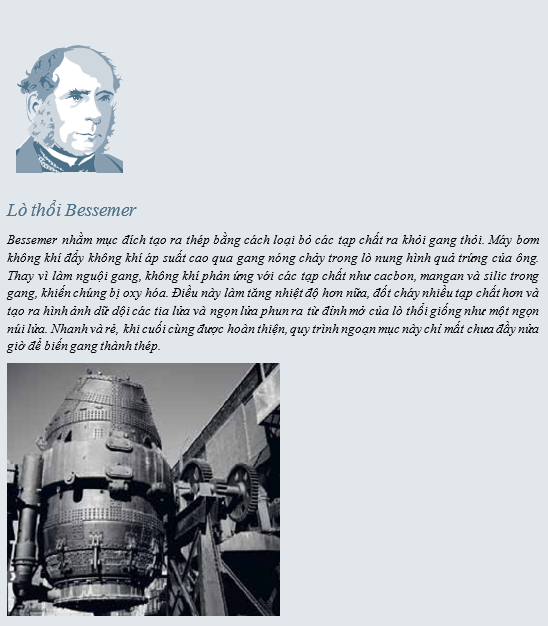 Sự biến đổi này phần lớn gắn liền với công trình của một nhà phát minh người Anh, Henry Bessemer. Có thể cho rằng bước tiến có ảnh hưởng nhất của cuộc Cách mạng Công nghiệp sau này, quy trình Bessemer đã hình thành nên trái tim của ngành sản xuất thép trong hơn 100 năm. Được giới thiệu vào năm 1856, nó đã cách mạng hóa ngành công nghiệp bằng phương pháp nhanh chóng, chỉ phí thâp để sản xuất thép với số lượng lớn.